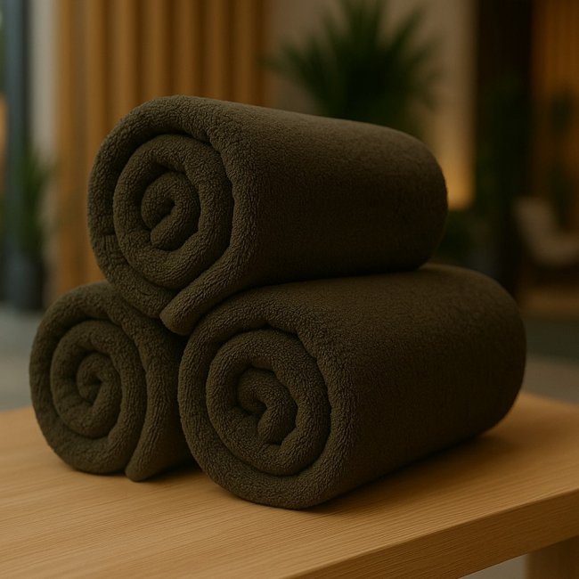 Koyu haki spa masaj havlusu, %100 pamuk 16/1 ring iplik teknolojisiyle dokunmuş, 90x180 cm ölçüsünde ve 810 gr ağırlığında üretilmiştir. 500 gr/m² (GSM) Kumaş yoğunluğu sayesinde yüksek emicilik, yumuşak doku, endüstriyel yıkamaya dayanıklılık ve uzun ömürlü kullanım sunar. Spa, masaj, wellness merkezleri ve benzeri işletmeler için idealdir.